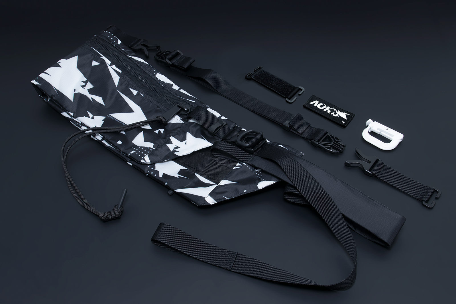 A hybrid of military bandolier [long magazine carrier worn as a crossbody bag] and fannypack. The design is based on the as above so below concept, there are contrasting parts that are fully symetrical. TIGERSHARD-B camouflage is original AOKU designed and produced pattern.